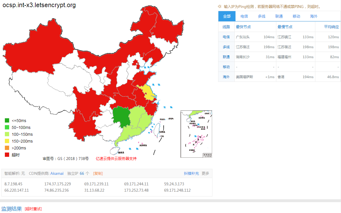 微信小程序首次请求慢 Safari浏览器访问慢 pending 10秒 可能是HTTPS证书的锅 home 编辑时间 2020/06/11  <br><br> ## 问题 服务端证书使用的是 `Let's Encrypt` 问题的起因是IOS系统中使用微信小程序,请求服务器接口,首次请求需要等待3 ~ 10秒。导致小程序初次打开白屏。 在反复验证后,排除了Nginx、Tomcat、Java等问题。最终锁定了问题出在HTTPS证书上。 最终参考了V站大佬的帖子才恍然大悟。 [https://v2ex.com/t/665734](https://v2ex.com/t/665734) 在某些系统以及某些特定的浏览器下,会要求在线校验证书的有效性,称为 `在线证书状态协议 (Online Certificate Status Protocol)` 简称 `OCSP` ,测试后发现比较新的`Chrome内核`和`Firefox内核` **不会** 进行校验,而苹果系统下的Safari **会** 校验,IE **未知** ,在IOS系统的微信小程序 **会** 校验,Android系统的微信小程序则 **不会** 进行校验 补充一下:校验地址如果访问不通,会一直等到访问超时,所以会peding 3 ~ 10秒,超时以后会默认为安全,所以不会出现证书不安全的提示。本次访问的后续请求依然可以正常执行,只会表现为首次请求慢。 <br><br> ## 测试 经测试,`Let's Encrypt` 的证书的OCSP地址是 [ocsp.int-x3.letsencrypt.org ](ocsp.int-x3.letsencrypt.org ) 这个地址在国内大部分地区都无法请求成功,俗称被墙 **测试地址** [https://ping.chinaz.com/ocsp.int-x3.letsencrypt.org](https://ping.chinaz.com/ocsp.int-x3.letsencrypt.org) **测试结果**  上述结果中的绿色部分也只是极个别情况,该地区的99%的运营商其实也是红色超时状态,白色是仍然在 `pending ` 中,我懒得继续等了 <br><br> ## 解决 **方案1 换证书 (推荐)** 目前除了 `Let's Encrypt` 以外,就只剩下 `亚洲诚信` 可以申请到免费的HTTPS SSL证书了,不过 `Let's Encrypt` 是支持多域名、泛域名的。而 `亚洲诚信` 免费证书只能申请单域名。 到例如腾讯云、阿里云、又拍云的管理后台,搜索SSL证书,申请即可,一般当天可以获得一张一年有效期的单域名证书,支持下载证书文件。其中主域名 `abc.com` 和 `www.abc.com` 是可以共用一张证书的,按 `abc.com` 申请即可。其他二级域名例如 `music.abc.com` 需要多次申请 <br> **方案2 OCSP Stapling** 这是一个曲线救国的方案,也就是在Nginx配置OCSP的校验地址,到你自己的服务器或CDN,来避免访问不通原地址。 这个方案我没有具体实施,所以建议参考这几篇文章,说的比较详细了 **CDN方案** [https://www.alibabacloud.com/help/zh/doc-detail/160607.htm](https://www.alibabacloud.com/help/zh/doc-detail/160607.htm) **Nginx方案** [https://www.jianshu.com/p/540124f370e0](https://www.jianshu.com/p/540124f370e0) <br><br> ## END 送人玫瑰,手留余香 赞赏 Wechat Pay Alipay Windows 安装 Emscripten 准备入门 WebAssembly SpringBoot 项目使用 Jackson 实现解析和序列化 JSON 彻底抛弃FastJson