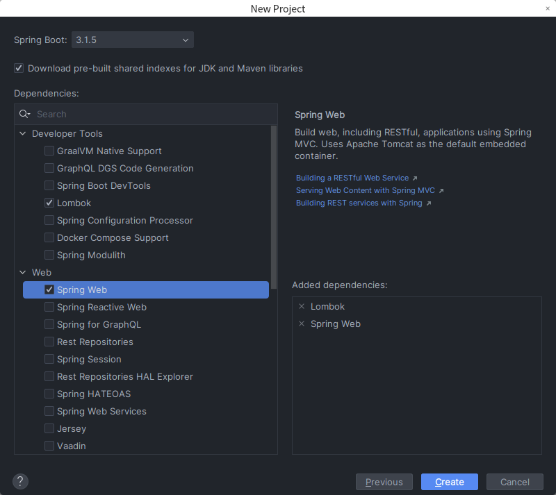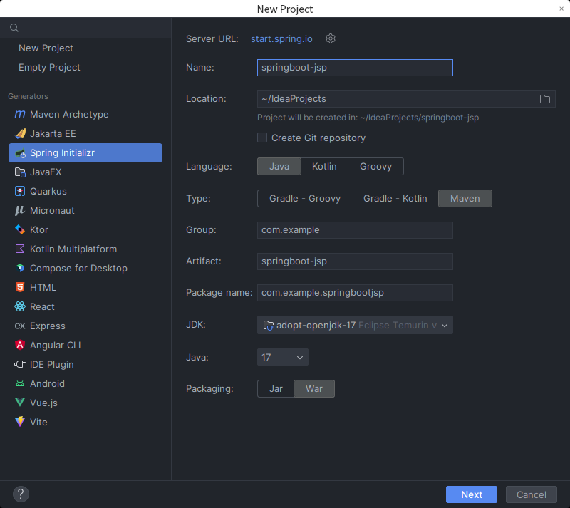 Springboot 3.x 项目使用 JSP 笔记 home 编辑时间 2023/11/23  ## 前言 **首先需要说明!这是一个不被推荐的操作!** 官方推荐用thymeleaf等模板引擎做页面渲染 JSP默认状态是不开启,需要手动配置后才能使用 本文只讲配置过程,这样用是否合理看你的具体业务需求 ## 折腾 开发工具 `IntelliJ IDEA 2023.2.4 (Ultimate Edition)` <br> 新建项目(必须war包)  <br> 第二步, 选择 `Lombok` `Spring Web`  <br> **错误打开方式** 直觉上这里在 `resources/static` 下新建 `index.jsp` 启动项目 发现访问 `http://localhost:8080/index.jsp` 结果404 <br> **正确打开方式** 再次强调一下开局创建项目必须选war包,这个坑我爬了好久 大致思路: 1. 首先第一个思路是要让jsp可以正常被访问到 2. 进阶版要结合spirngboot提前查数据塞数据传给jsp渲染 具体操作 删了一些用不到的文件文件夹 `maven`加依赖 (我直接发了完整的依赖如下) ```xml <dependency> <groupId>org.springframework.boot</groupId> <artifactId>spring-boot-starter-web</artifactId> </dependency> <dependency> <groupId>org.projectlombok</groupId> <artifactId>lombok</artifactId> <optional>true</optional> </dependency> <dependency> <groupId>org.springframework.boot</groupId> <artifactId>spring-boot-starter-tomcat</artifactId> <scope>provided</scope> </dependency> <!-- 下面是新增的依赖 --> <dependency> <groupId>org.apache.tomcat.embed</groupId> <artifactId>tomcat-embed-jasper</artifactId> <scope>provided</scope> </dependency> <dependency> <groupId>jakarta.servlet</groupId> <artifactId>jakarta.servlet-api</artifactId> <version>6.0.0</version> <scope>provided</scope> </dependency> <dependency> <groupId>org.glassfish.web</groupId> <artifactId>jakarta.servlet.jsp.jstl</artifactId> <version>3.0.0</version> </dependency> ``` `main`目录下新建文件夹 `webapp` `webapp`下新建文件 `index.jsp` ```jsp <%@ page contentType="text/html;charset=UTF-8" language="java" %> <html> <head> <title>Title</title> </head> <body> <%="666"%> </body> </html> ``` 启动项目,访问`http://localhost:8080/index.jsp` 这里已经可以看到访问成功了。  到这一步时项目路径文件位置关系如下 ```treeview springboot-jsp/ |-- src/ | |-- main/ | | |-- java/ | | | |-- com.example.springbootjsp/ | | | | |-- ServletInitializer.java | | | | |-- SpringbootJspApplication.java | | |-- resources/ | | | |-- application.yml | | |-- webapp/ | | | |-- index.jsp `-- pom.xml ``` 继续改进到可以和controller联动 修改springboot配置 application.yml ```yml server: port: 8080 servlet: context-path: / spring: mvc: view: prefix: / suffix: .jsp ``` 新建 `controller/JSPController.java` ```java import org.springframework.stereotype.Controller; import org.springframework.ui.Model; import org.springframework.web.bind.annotation.GetMapping; @Controller public class JSPController { @GetMapping("/index") public String index(Model model) { model.addAttribute("message","测试springboot-jsp传参"); return "index"; } } ``` 修改 `index.jsp` ```jsp <%@ page contentType="text/html;charset=UTF-8" language="java" %> <%@ taglib prefix="spring" uri="http://www.springframework.org/tags"%> <%@ taglib prefix="c" uri="jakarta.tags.core" %> <html> <head> <title>Title</title> </head> <body> ${message} </body> </html> ``` 重启项目访问 `http://localhost:8080/index` 可以看到后端注入的参数  更多的spring搭配jsp用法可以参考文末的 `JSP and JSTL` 链接查看官方文档 ## 关于Maven报错 2023-11-25 补充 ## END 总结:虽说这种方法不被官方推荐,但自己写写练手的项目正合适,再学 `Themeleaf` or `Freemaker` 头都学秃了 参考 [关于2023年如何开发一个Java JSP JSTL项目指南](https://zzzmh.cn/post/ht5by72c3fofjltmqcqork37gpyd92ev) [SpringBoot项目中如何使用Jsp(CSDN)](https://blog.csdn.net/weixin_53168000/article/details/126662098) [在SpringBoot中实现对jsp的支持,超详细配置!(知乎)](https://zhuanlan.zhihu.com/p/498924995) [JSP and JSTL(Spring)](https://docs.spring.io/spring-framework/reference/web/webmvc-view/mvc-jsp.html) 送人玫瑰,手留余香 赞赏 Wechat Pay Alipay 解决JSTL报错 java.lang.ClassNotFoundException: org.apache.jsp.index_jsp 关于2023年如何开发一个Java JSP JSTL项目指南