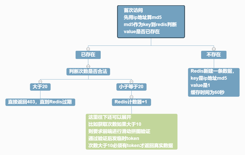 OpenResty Lua脚本实战 反爬虫限制IP访问频率 home 编辑时间 2022/10/19  <br><br> ## 前言 结合上一篇 [OpenResty yum 方式安装 支持 CentOS 7和8](https://leanote.zzzmh.cn/blog/post/admin/634e1094da74050013015530) 这一篇学习 `OpenResty` 最重要的一个部分 `Lua` 脚本 实战写一个限制IP频率等简单反爬虫脚本 先说明这样的脚本网上有很多例子,随便 `Ctrl + C` 就能实现这功能,但我希望的是学会 `Lua` 语法,以便以后自由实现各种功能 <br><br> ## 折腾 为防止搞奔溃线上环境,这一篇仅在本地docker中完成编写和测试 <br> **Docker安装OpenResty** ```shell docker run -d -p 8000:80\ -e "TZ=Asia/Shanghai"\ -m 200M --oom-kill-disable --memory-swap=-1\ --name openresty\ openresty/openresty ``` <br> 访问 [localhost:8000](http://localhost:8000/) 看到下面这个画面说明启动成功  <br> 接下来遇到一个问题,操作openresty内部的文件不太方便,这里选择复制内部文件到外面,再重新开容器映射到里面 (我这里外面是linux系统的虚拟机) ```shell # 复制内部目录到外部 停止并删除容器 docker cp openresty:/usr/local/openresty /home/docker/ sudo chmod -R 777 openresty docker stop openresty docker rm openresty # 重新启动容器 将外部目录映射给内部 这里顺便把redis和mysql关联一下 docker run -d -p 8000:80\ -e "TZ=Asia/Shanghai"\ -m 200M --oom-kill-disable --memory-swap=-1\ -v /home/docker/openresty:/usr/local/openresty\ --link mysql\ --link redis\ --name openresty\ openresty/openresty ``` <br> 到这里还发现一个小问题,直接操作 `nginx.conf` 没效果,后来发现容器内部有一个 `default.conf` 需要先删除 ```shell docker exec -it openresty bash cd /etc/nginx/conf.d/ rm -f default.conf ``` <br> 至此 就可以在 `/home/docker/openresty/` 目录下操作,然后浏览器访问 [localhost:8000](http://localhost:8000/),看效果,有些操作需要重启生效 <br> 找到nginx配置文件,稍微精简了一下 `/home/docker/openresty/nginx/conf/nginx.conf` ```shell user root; worker_processes 8; events { worker_connections 1024; } http { include mime.types; default_type text/html; keepalive_timeout 65; include /etc/nginx/conf.d/*.conf; server { listen 80; server_name localhost; location / { root html; index index.html index.htm; } error_page 500 502 503 504 /50x.html; location = /50x.html { root html; } } } ``` <br> 修改后需要重新加载配置文件才会生效 ```shell # 进入容器 docker exec -it openresty bash # 测试配置文件是否正确 openresty -t # 如果没有异常 可以重新加载配置文件 openresty -s reload ``` <br> 先实现个helloword证明已跑通 在nginx目录下新建一个lua文件夹 再在文件夹内新建一个lua文件 `hello.lua` ```shell server { location / { # 执行lua脚本文件 content_by_lua_file lua/hello.lua; # root html; # index index.html index.htm; } ... } ``` <br> `nginx/lua/hello.lua` ```lua ngx.say('Hello Lua!'); ``` <br> 最后在容器里重新加载配置文件 ```shell docker exec -it openresty bash openresty -s reload ``` 访问[localhost:8000](http://localhost:8000/) 即可看到 `Hello Lua!` <br><br> 接下来可以直接快进到写本篇主题:反爬虫的脚本实现 思路如下图 (例子用的是60秒20次的限制,也可以改成任意时间任意次数)  <br><br> `nginx.conf` ```shell server { location / { # 执行lua脚本文件 content_by_lua_file lua/access_limit.lua; # root html; # index index.html index.htm; } ... } ``` `access_limit.lua` ```lua local redis_iresty = require "resty.redis_iresty" local redis = redis_iresty:new() local key = ngx.md5(ngx.var.remote_addr) local count = redis:get(key); if count then -- 大于单位时间的限制次数则给与500错误 测试暂定200次60秒 if tonumber(count) > 200 then ngx.exit(ngx.HTTP_INTERNAL_SERVER_ERROR) else -- 次数仍在正常范围则只 +1 记录次数 redis:incr(key) end else -- 首次访问次数记为1 redis:set(key, 1) -- 过期时间60秒 redis:expire(key, 60) end -- 在测试页面打印key value ttl 3个值 ngx.say(key..'<br>'..redis:get(key)..'<br>'..redis:ttl(key)) ``` <br><br> **这里需要注意!** `local redis = require "resty.redis_iresty"` 这行代码默认是跑不通的,因为不存在这个库,这是一位up主自己实现并封装的库,需要预先加入到resty文件夹中。 参考 [Redis 接口的二次封装 (gitbooks)](https://moonbingbing.gitbooks.io/openresty-best-practices/content/redis/out_package.html) 具体操作是 在目录 `openresty/lualib/resty/` 下 新增一个文件 `redis_iresty.lua` 内容如下,注意:其中redis连接的IP地址和PORT端口,需要改为你实际情况的 ```lua local redis_c = require "resty.redis" local ok, new_tab = pcall(require, "table.new") if not ok or type(new_tab) ~= "function" then new_tab = function (narr, nrec) return {} end end local _M = new_tab(0, 155) _M._VERSION = '0.01' local commands = { "append", "auth", "bgrewriteaof", "bgsave", "bitcount", "bitop", "blpop", "brpop", "brpoplpush", "client", "config", "dbsize", "debug", "decr", "decrby", "del", "discard", "dump", "echo", "eval", "exec", "exists", "expire", "expireat", "flushall", "flushdb", "get", "getbit", "getrange", "getset", "hdel", "hexists", "hget", "hgetall", "hincrby", "hincrbyfloat", "hkeys", "hlen", "hmget", "hmset", "hscan", "hset", "hsetnx", "hvals", "incr", "incrby", "incrbyfloat", "info", "keys", "lastsave", "lindex", "linsert", "llen", "lpop", "lpush", "lpushx", "lrange", "lrem", "lset", "ltrim", "mget", "migrate", "monitor", "move", "mset", "msetnx", "multi", "object", "persist", "pexpire", "pexpireat", "ping", "psetex", "psubscribe", "pttl", "publish", --[[ "punsubscribe", ]] "pubsub", "quit", "randomkey", "rename", "renamenx", "restore", "rpop", "rpoplpush", "rpush", "rpushx", "sadd", "save", "scan", "scard", "script", "sdiff", "sdiffstore", "select", "set", "setbit", "setex", "setnx", "setrange", "shutdown", "sinter", "si