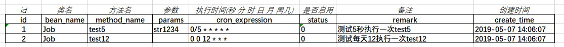 Springboot 通过自带的@Scheduled 实现定时任务 home 编辑时间 2019/05/06  ## 需求 项目中需要用到一些简单的定时任务,定时执行一些事先写好的java方法 但具体何时执行等,需要做到数据库,实现动态配置 最终选择采用Springboot自带的方案 `@Schedule` 或 `SchedulingConfigurer` 来实现 ## 参考 参考以下文章 https://www.cnblogs.com/mmzs/p/10161936.html https://www.cnblogs.com/zt007/p/8954096.html ## 数据库  ## 代码 **主要依赖** `Springboot2` `MybatisPLus` <br> 定时任务方法类 `Job.java` ```java /** * 定时任务 * zmh * 2019-5-7 13:54:08 */ public class Job { public void test5(String str){ System.out.println("定时任务 5秒执行一次 参数:" + str); } public void test12(){ System.out.println("定时任务 12点执行一次 无参数"); } } ``` <br> 配置定时任务 `ScheduleConfig.java` ```java import com.baomidou.mybatisplus.core.conditions.query.QueryWrapper; import com.xxx.xxx.entity.QuarztJob; import com.xxx.xxx.service.IQuarztJobService; import org.slf4j.Logger; import org.slf4j.LoggerFactory; import org.springframework.beans.factory.annotation.Autowired; import org.springframework.context.annotation.Configuration; import org.springframework.scheduling.Trigger; import org.springframework.scheduling.TriggerContext; import org.springframework.scheduling.annotation.EnableScheduling; import org.springframework.scheduling.annotation.SchedulingConfigurer; import org.springframework.scheduling.config.ScheduledTaskRegistrar; import org.springframework.scheduling.support.CronTrigger; import org.springframework.stereotype.Component; import java.util.Date; import java.util.List; import java.util.Map; /** * zzzmh * 2019-5-6 16:29:56 * 动态定时任务 */ @Configuration @EnableScheduling public class ScheduleConfig implements SchedulingConfigurer { @Autowired private IQuarztJobService quarztJobService; /** * 注册定时任务 * * 程序启动先获取所有任务id,并逐一查询出最新状态和执行时间 * 如果状态status = 1说明是暂停中,跳过执行,但依旧注册 * 每次执行前查看数据库最新的任务状态 任务目标和参数 * 每次执行后查看数据库注册最新的下次执行时间 */ @Override public void configureTasks(ScheduledTaskRegistrar taskRegistrar) { QueryWrapper<QuarztJob> wrapper = new QueryWrapper<>(); // 查询所有任务id (这一步先不管 status) List<Map<String, Object>> list = quarztJobService.listMaps(wrapper.select("id")); // 根据数据库配置实时触发 for (Map<String, Object> map : list) { int id = (int) map.get("id"); taskRegistrar.addTriggerTask( // 添加任务内容(Runnable) () -> { // 从数据库获取执行任务 每次要确保拿最新的 QuarztJob job = quarztJobService.getById(id); // 如果 status 是1 代表暂停 跳过任务 if (job.getStatus().intValue() == 0) { try { // 这里通过反射调用方法 // 包名根据实际Bean所在位置调整 String pack = "com.xxx.xxx.quarztJob."; Class<?> obj = Class.forName(pack + job.getBeanName()); // 考虑程序复杂度,简化为根据数据库参数字段是否为空 要么无参数 要么单String类型参数 String params = job.getParams(); if (StringUtils.isBlank(params)) { Method method = obj.getMethod(job.getMethodName()); // 每次new一个新对象 method.invoke(obj.newInstance()); } else { Method method = obj.getMethod(job.getMethodName(), String.class); // 每次new一个新对象 method.invoke(obj.newInstance(), params); } } catch (Exception e) { e.printStackTrace(); } } }, // 设置执行周期(Trigger) triggerContext -> { // 从数据库获取执行周期 每次要确保拿最新的 QuarztJob job = quarztJobService.getById(id); String cron = job.getCronExpression(); // 返回执行周期(Date) return new CronTrigger(cron).nextExecutionTime(triggerContext); } ); } } } ``` ## 运行结果  需要注意:由于用了反射方法,定时任务数据库和实体类之间的配置必须一一对应,否则会一触发就报错! 另外直接在Job中使用@Autowired 存在无法注入Service问题 目前我用的解决方案是从注册定时任务的地方传参 ## END 欢迎关注 个人博客: https://zzzmh.cn 学习笔记: https://leanote.zzzmh.cn 极简壁纸: https://bz.zzzmh.cn 极简插件: https://chrome.zzzmh.cn 送人玫瑰,手留余香 赞赏 Wechat Pay Alipay 关于Nginx日志输出格式问题 【转载】Nginx配置文件nginx.conf中文详解