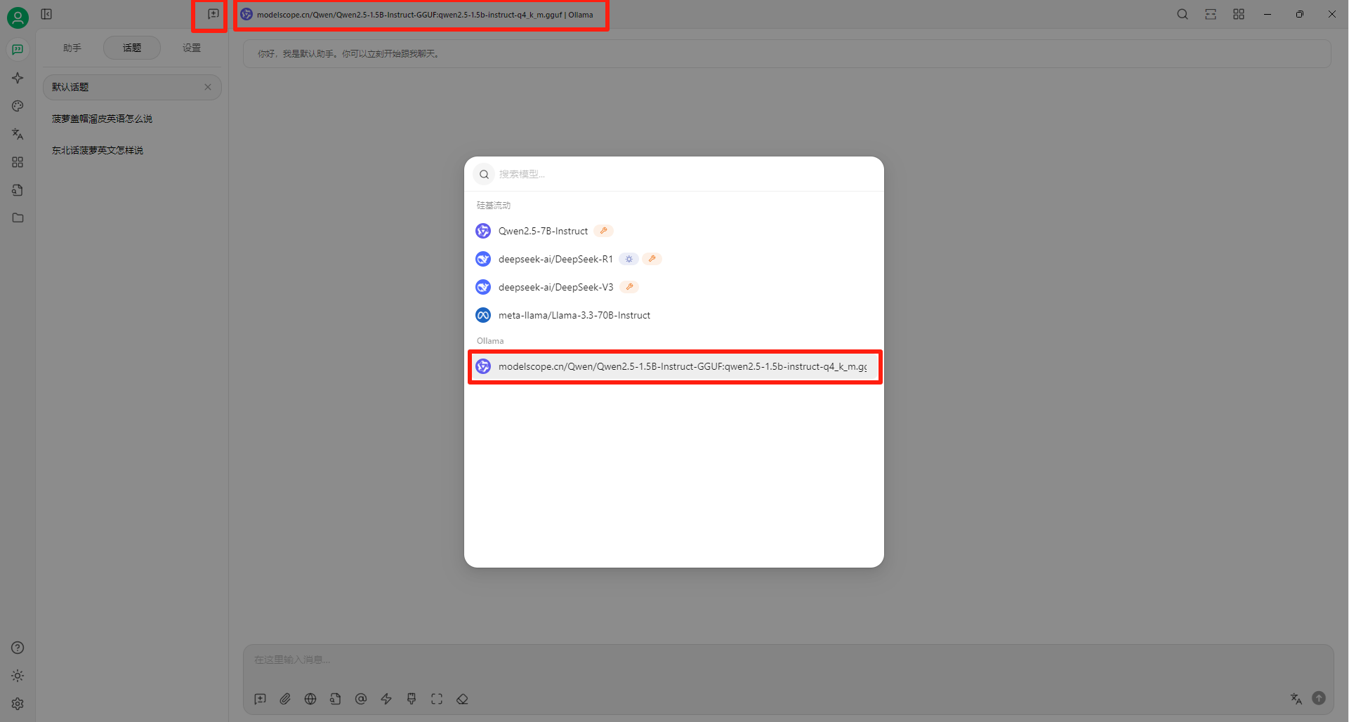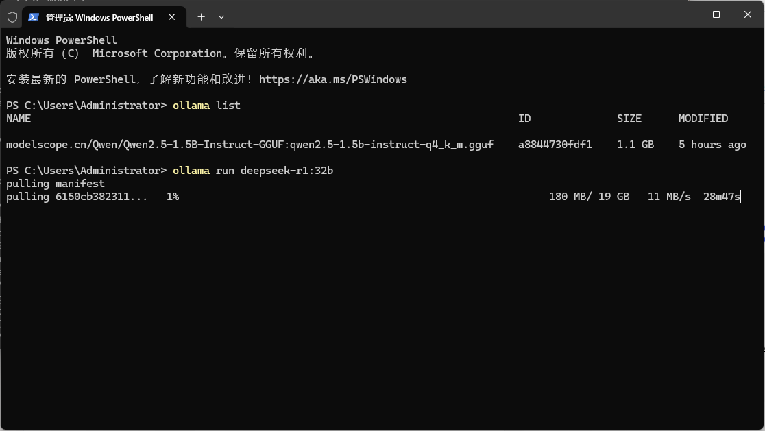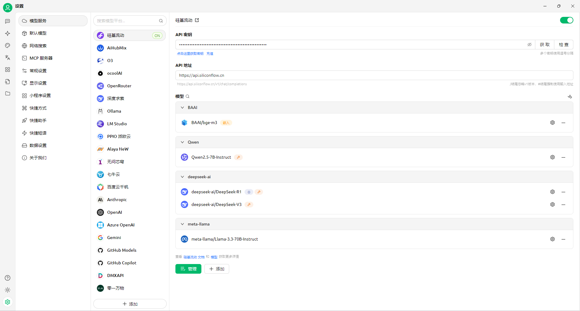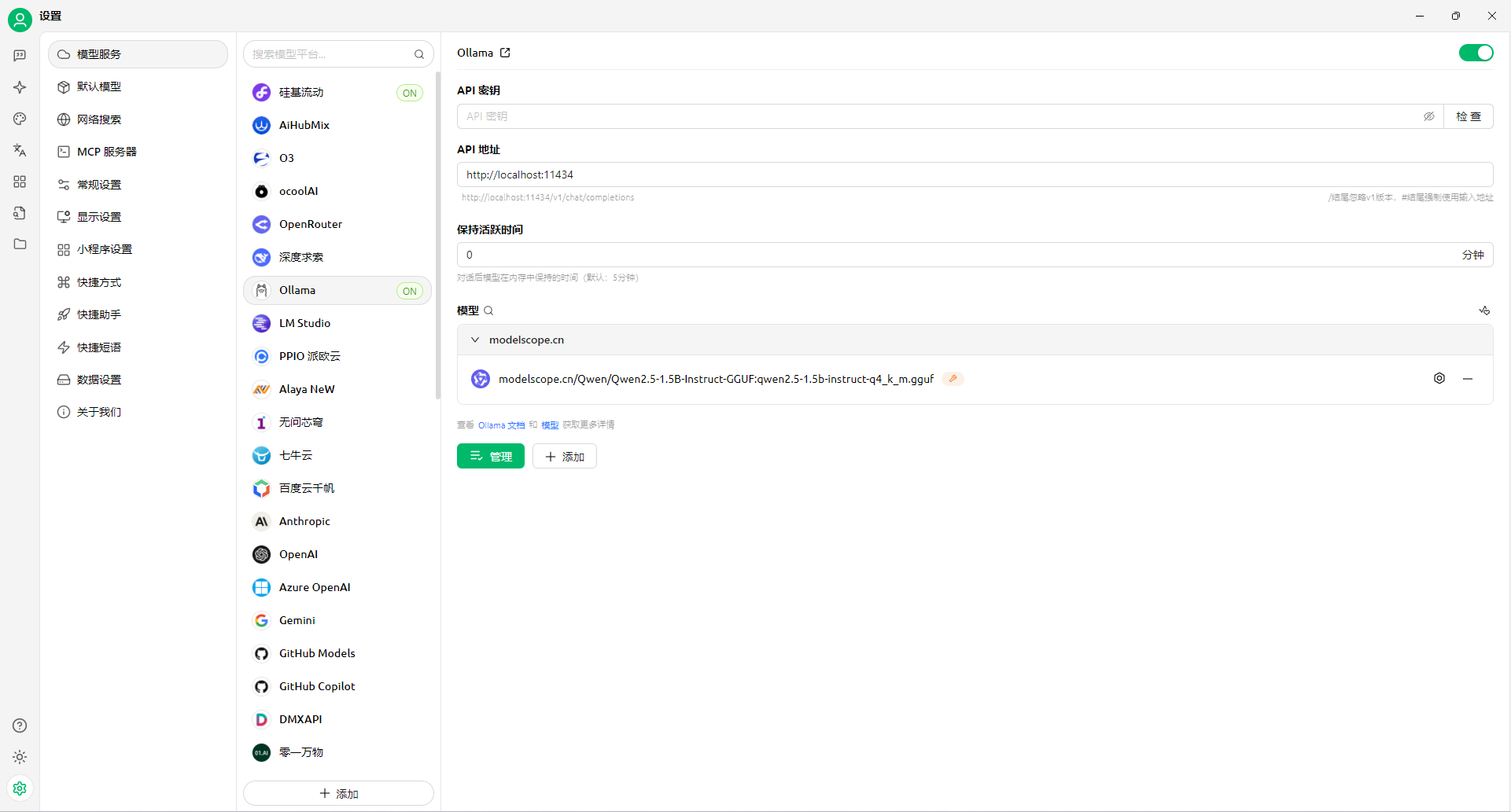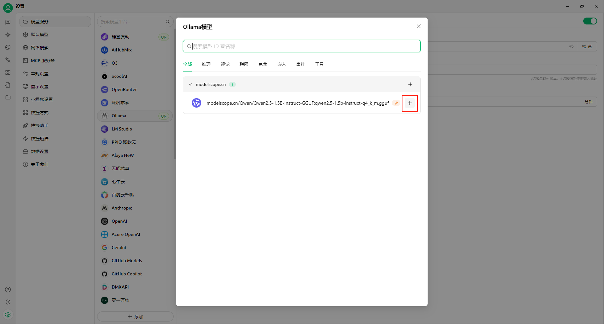Windows11 Ollama Deepseek 通义千问 CherryStudio MCP入门笔记 home 编辑时间 2025/04/16  <br><br> ## 前言 <br><br> ## 折腾 <br> **第一步下载安装Ollama** https://ollama.com/download/windows <br> **第二步安装本地模型** 这里ollama官方就有模型库 https://ollama.com/search <br> 包含绝大部分主流模型 比如说选择DeepSeekR1 32B (对应16G显存的显卡) 如图,官方直接给了类似于Docker的安装命令,会自动从ollama官方模型库中下载安装 命令: `ollama run deepseek-r1:32b` 此时把命令丢到powershell里就可以直接一键安装模型了 <br>  <br>  <br> 另外一个方法就是第三方模型库里面可以下载gguf文件 <br> 具体方法就是先去魔塔社区搜模型 https://www.modelscope.cn/models 魔塔自己还有一个ollama加载魔塔模型教程文档 https://www.modelscope.cn/docs/models/advanced-usage/ollama-integration <br> 比如 关键字 `deepseek r1 32b gguf` 这里必须要gguf的格式的模型才可以本地运行  <br>  <br>  <br> 这里通过 库名+项目名+ 冒号+文件名拼接 得到完整下载地址 `unsloth/DeepSeek-R1-Distill-Qwen-32B-GGUF:DeepSeek-R1-Distill-Qwen-32B-Q6_K.gguf` 再在前面加上固定的魔塔专用的链接 `ollama run modelscope.cn/` <br> 完整的就是 `ollama run modelscope.cn/unsloth/DeepSeek-R1-Distill-Qwen-32B-GGUF:DeepSeek-R1-Distill-Qwen-32B-Q6_K.gguf` <br> 放在windows的管理员权限的powershell运行就可以了 (win11入口是右击开始菜单,选择 '管理员终端') 如图已开始下载模型 (另外此方式优点是方便,一条命令,不写配置文件,缺点是不支持断点续传,如果中断就要从头开始)  <br> 如果此时此刻,26G的DeepSeekR1 32BQ6K下载太慢,或者显卡跑不太起来。 这里再推荐一个迷你的,显卡1060都能顺畅跑的。擅长中文翻译的。且总大小只有1.1G的。 通义千问2.5-1.5B-Q4 KM https://modelscope.cn/models/Qwen/Qwen2.5-1.5B-Instruct-GGUF/file/view/master?fileName=qwen2.5-1.5b-instruct-q4_k_m.gguf&status=2 <br> 完整命令是 `ollama run modelscope.cn/Qwen/Qwen2.5-1.5B-Instruct-GGUF:qwen2.5-1.5b-instruct-q4_k_m.gguf` <br> 下载完成以后,通义千问会默认被启用,直接可以在powershell中对话  用 `/bye` 命令可以退出对话 <br> 退出对话后,用 'ollama list' 可以看当前有哪些模型  <br> **第三步 安装图形化软件 cherry-studio** cherry-studio 用于图形化界面,补全ollama没有图形化的部分 https://cherry-ai.com/download 首次启动界面是这样的,如果现在对话,会报401,因为没有配置地址和token  <br> 这里再推荐一个网站 硅基流动 https://cloud.siliconflow.cn/i/2u9olIBn 此网站包含几乎所有主流AI的API和TOKEN 相当于你把钱充值到硅基流动,然后用硅基流动提供的API地址 随便用哪个AI,都扣的硅基流动的余额。首次注册送14元余额。 <br> 所以cherry-studio是有2种用法 1. 是本地部署AI,燃烧显卡,然后充当ollama的图形界面用 2. 是充值线上AI,燃烧人民币,获取API和TOKEN <br> 再补充一下 线上并不一定全都要收费 我这里企图白嫖,点了一下免费模型 发现硅基流动的模型库里,还真有一堆免费模型 而且本地费劲巴拉,只能跑 `千问2.5 1.5b q4 km` 人家免费版直接给你 `千问 7b` 破防了 <br> 本着白嫖即是正义的原则,这里再分叉一下,先讲下如何用cherry studio + 硅基流动,纯线上不烧显卡的前提下,白嫖token <br> 注册 [硅基流动](https://cloud.siliconflow.cn/i/2u9olIBn) 并点击首页 API密钥 获取API密钥 https://cloud.siliconflow.cn/account/ak  <br> 点击密钥复制 粘贴到cherry studio的设置的模型服务中的硅基流动  <br> 为了防止用他现有的模型可能会收费 接下来我自己添加几个免费模型进来 <br> 访问硅基流动模型库 https://cloud.siliconflow.cn/models <br> 点 `显示筛选器` 点 `只看免费`  <br> 选择一个模型点击进入详情 我这里选择千问2.5 7b演示 点击右侧模型ID 复制 模型ID  <br> 回到 cherry studio 的设置中的硅基流动界面 点击添加 然后粘贴模型id 点添加模型即可  <br> 这里我点添加,出现模型已存在,说明默认自带的这个千问就已经是免费版了 <br> 回到 cherry studio 首页 点击顶部tab切换模型  <br> 随便聊了一下 发现千问7B的智商堪比弱智siri  对比一下同样是硅基流动模型库自带的Deepseek V3  虽然翻译的有点矫揉造作,但是至少反向对了,智商在线 <br> 回到主线剧情,配置ollama到cherry studio 进到cherry studio的设置界面找ollama  这里不需要API,直接点绿色的管理按钮 就可以看到你本地ollama里已安装的模型 点加号添加即可  <br> 回到首页 点击顶部切换模型 点击左上角新建聊天  <br> 这里给他出了一个简单点的翻译问题 毕竟只是1.1G的千问2.5 1.5b 不能要求太高 测试效果一言难尽,速度是快了,内容是一泡污  同样要放一段deepseek v3作为对比,才知道优等生和差生到底差别在哪  <br><br> ## END 本文思路学习了了UP主AI博士嗨嗨的视频 https://www.bilibili.com/video/BV1hXPkeGEiw 送人玫瑰,手留余香 赞赏 Wechat Pay Alipay 沉浸式翻译 Chrome插件 对接本地 Ollama 大模型 笔记 Oracle VirtualBox虚拟机 Alpine Linux v3.21 安装Docker