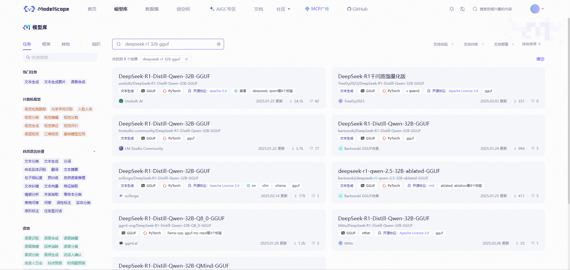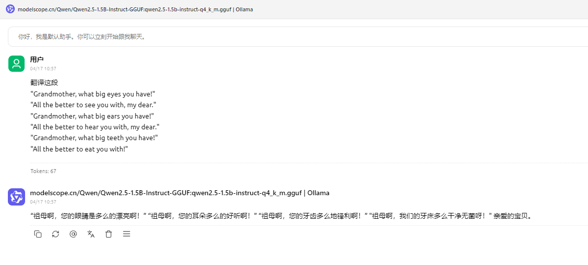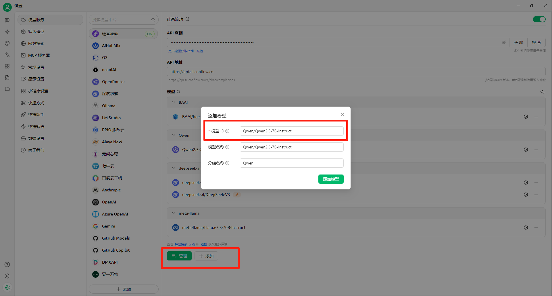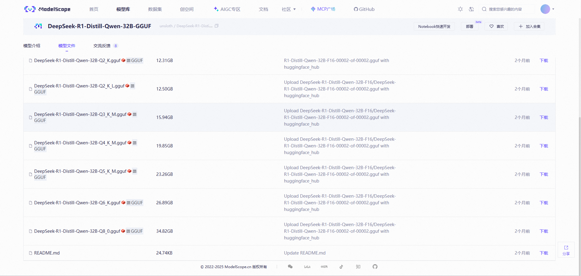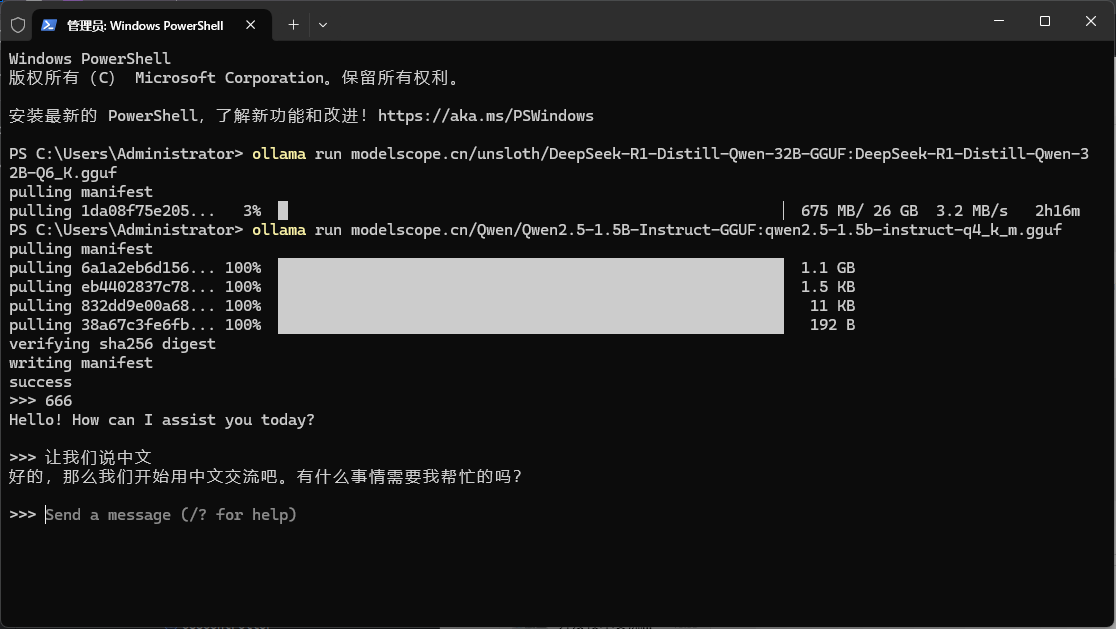 Windows11 Ollama Deepseek 通义千问 CherryStudio MCP入门笔记 home 编辑时间 2025/04/16  <br><br> ## 前言 <br><br> ## 折腾 <br> **第一步下载安装Ollama** https://ollama.com/download/windows <br> **第二步安装本地模型** 这里ollama官方就有模型库 https://ollama.com/search <br> 包含绝大部分主流模型 比如说选择DeepSeekR1 32B (对应16G显存的显卡) 如图,官方直接给了类似于Docker的安装命令,会自动从ollama官方模型库中下载安装 命令: `ollama run deepseek-r1:32b` 此时把命令丢到powershell里就可以直接一键安装模型了 <br>  <br>  <br> 另外一个方法就是第三方模型库里面可以下载gguf文件 <br> 具体方法就是先去魔塔社区搜模型 https://www.modelscope.cn/models 魔塔自己还有一个ollama加载魔塔模型教程文档 https://www.modelscope.cn/docs/models/advanced-usage/ollama-integration <br> 比如 关键字 `deepseek r1 32b gguf` 这里必须要gguf的格式的模型才可以本地运行  <br>  <br>  <br> 这里通过 库名+项目名+ 冒号+文件名拼接 得到完整下载地址 `unsloth/DeepSeek-R1-Distill-Qwen-32B-GGUF:DeepSeek-R1-Distill-Qwen-32B-Q6_K.gguf` 再在前面加上固定的魔塔专用的链接 `ollama run modelscope.cn/` <br> 完整的就是 `ollama run modelscope.cn/unsloth/DeepSeek-R1-Distill-Qwen-32B-GGUF:DeepSeek-R1-Distill-Qwen-32B-Q6_K.gguf` <br> 放在windows的管理员权限的powershell运行就可以了 (win11入口是右击开始菜单,选择 '管理员终端') 如图已开始下载模型 (另外此方式优点是方便,一条命令,不写配置文件,缺点是不支持断点续传,如果中断就要从头开始)  <br> 如果此时此刻,26G的DeepSeekR1 32BQ6K下载太慢,或者显卡跑不太起来。 这里再推荐一个迷你的,显卡1060都能顺畅跑的。擅长中文翻译的。且总大小只有1.1G的。 通义千问2.5-1.5B-Q4 KM https://modelscope.cn/models/Qwen/Qwen2.5-1.5B-Instruct-GGUF/file/view/master?fileName=qwen2.5-1.5b-instruct-q4_k_m.gguf&status=2 <br> 完整命令是 `ollama run modelscope.cn/Qwen/Qwen2.5-1.5B-Instruct-GGUF:qwen2.5-1.5b-instruct-q4_k_m.gguf` <br> 下载完成以后,通义千问会默认被启用,直接可以在powershell中对话  用 `/bye` 命令可以退出对话 <br> 退出对话后,用 'ollama list' 可以看当前有哪些模型  <br> **第三步 安装图形化软件 cherry-studio** cherry-studio 用于图形化界面,补全ollama没有图形化的部分 https://cherry-ai.com/download 首次启动界面是这样的,如果现在对话,会报401,因为没有配置地址和token  <br> 这里再推荐一个网站 硅基流动 https://cloud.siliconflow.cn/i/2u9olIBn 此网站包含几乎所有主流AI的API和TOKEN 相当于你把钱充值到硅基流动,然后用硅基流动提供的API地址 随便用哪个AI,都扣的硅基流动的余额。首次注册送14元余额。 <br> 所以cherry-studio是有2种用法 1. 是本地部署AI,燃烧显卡,然后充当ollama的图形界面用 2. 是充值线上AI,燃烧人民币,获取API和TOKEN <br> 再补充一下 线上并不一定全都要收费 我这里企图白嫖,点了一下免费模型 发现硅基流动的模型库里,还真有一堆免费模型 而且本地费劲巴拉,只能跑 `千问2.5 1.5b q4 km` 人家免费版直接给你 `千问 7b` 破防了 <br> 本着白嫖即是正义的原则,这里再分叉一下,先讲下如何用cherry studio + 硅基流动,纯线上不烧显卡的前提下,白嫖token <br> 注册 [硅基流动](https://cloud.siliconflow.cn/i/2u9olIBn) 并点击首页 API密钥 获取API密钥 https://cloud.siliconflow.cn/account/ak  <br> 点击密钥复制 粘贴到cherry studio的设置的模型服务中的硅基流动  <br> 为了防止用他现有的模型可能会收费 接下来我自己添加几个免费模型进来 <br> 访问硅基流动模型库 https://cloud.siliconflow.cn/models <br> 点 `显示筛选器` 点 `只看免费`  <br> 选择一个模型点击进入详情 我这里选择千问2.5 7b演示 点击右侧模型ID 复制 模型ID  <br> 回到 cherry studio 的设置中的硅基流动界面 点击添加 然后粘贴模型id 点添加模型即可  <br> 这里我点添加,出现模型已存在,说明默认自带的这个千问就已经是免费版了 <br> 回到 cherry studio 首页 点击顶部tab切换模型  <br> 随便聊了一下 发现千问7B的智商堪比弱智siri  对比一下同样是硅基流动模型库自带的Deepseek V3  虽然翻译的有点矫揉造作,但是至少反向对了,智商在线 <br> 回到主线剧情,配置ollama到cherry studio 进到cherry studio的设置界面找ollama  这里不需要API,直接点绿色的管理按钮 就可以看到你本地ollama里已安装的模型 点加号添加即可  <br> 回到首页 点击顶部切换模型 点击左上角新建聊天  <br> 这里给他出了一个简单点的翻译问题 毕竟只是1.1G的千问2.5 1.5b 不能要求太高 测试效果一言难尽,速度是快了,内容是一泡污  同样要放一段deepseek v3作为对比,才知道优等生和差生到底差别在哪  <br><br> ## END 本文思路学习了了UP主AI博士嗨嗨的视频 https://www.bilibili.com/video/BV1hXPkeGEiw 送人玫瑰,手留余香 赞赏 Wechat Pay Alipay 沉浸式翻译 Chrome插件 对接本地 Ollama 大模型 笔记 Oracle VirtualBox虚拟机 Alpine Linux v3.21 安装Docker